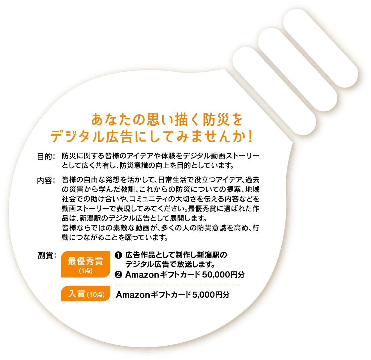 | 賞 品 | 最優秀賞作品 Amazonギフトカード 商品券50,000円分 入賞作品 Amazonギフトカード 商品券5,000 円分 |